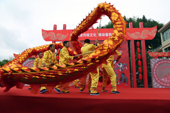 “舞龙摆字”是畲族村代代相传的民俗活动,来宾们争相观看、拍照。据传说,明朝万历年间,有十八位挑夫因运送武器及时,帮助郑成功打赢荷兰收复台湾,而后被封为“十八勇士”。当天晚上,郑成功为庆祝胜利,舞龙摆出“天下太平”四字,表示祝贺。