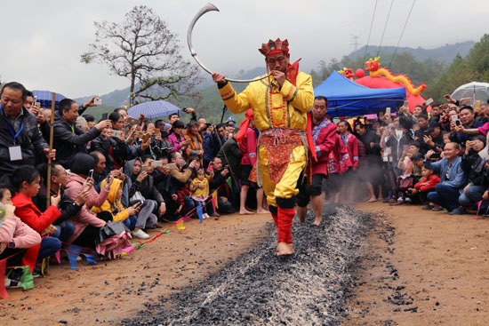 过火山为当天活动掀起了一个小高潮。过火山,又叫“下火海”,属于非物质文化遗产,是传统道教文化的一项绝活。太山村的“火海”由几十担木炭堆成一条长10米、宽80厘米,高30厘米的长方体,然后将木炭点燃,并用鼓风机助力火势,直到木炭全部燃烧。大师傅领头,口颂经文,带头赤脚从火红的炭火中走过。 藏于深山中的余朋乡太山村是畲族村,因战争及贫困等历史原因,多种习俗不同程度“消失”。近年来,清流县正全力做好旅游总体规划编制和资源开发,不断挖掘当地的民俗文化,积极引导村民陆续“复活”这些畲族习俗。如今,旅游产业已经成为清流的支柱产业。(巫建辉、邱燕宏) |
