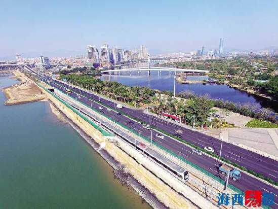 行驶在园博苑附近海堤段的地铁。记者 陈理杰摄