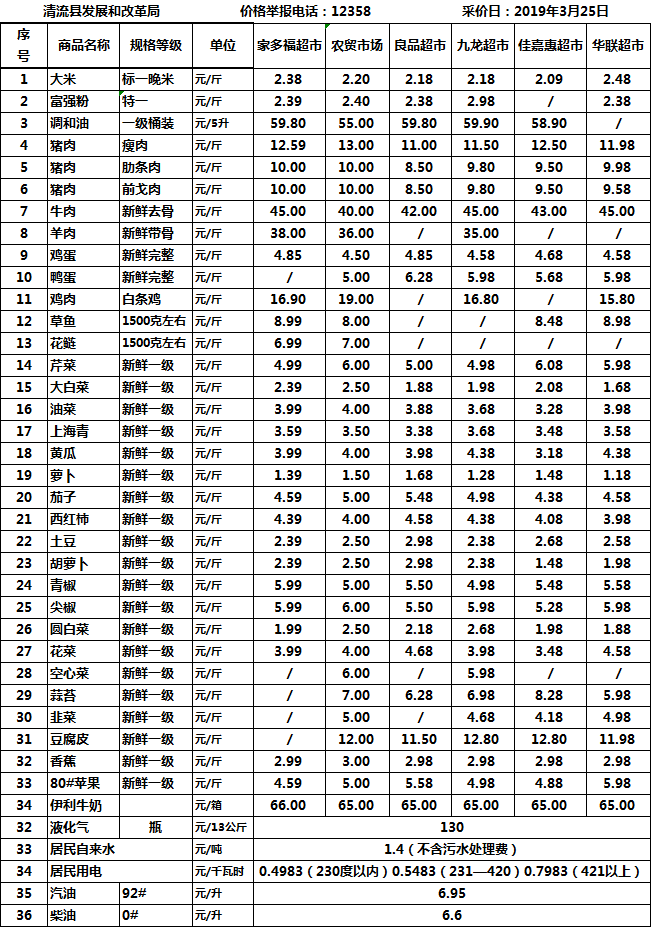 清流县民生价格行情(采价日:2019.03.25)