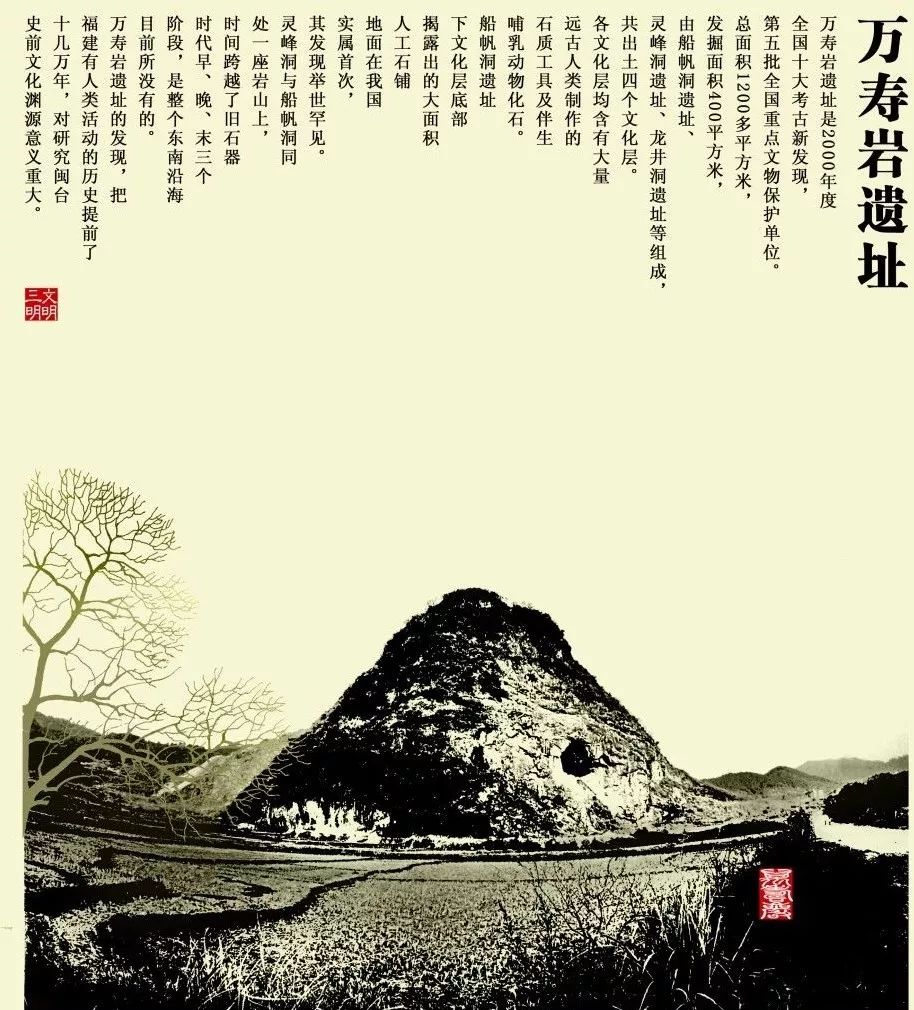 万寿岩遗址,位于三明市三元区岩前镇岩前村,年代横跨18.5万年至3万年,是迄今为止福建境内发现最早的旧石器时代洞穴类型的居住遗址。它的发现,把古人类在福建活动的历史提前到18.5万年。2000年1月,时任福建省代省长习近平同志先后两次对万寿岩遗址的保护作出重要批示,在此基础上,万寿岩遗址进行了三次考古发掘、进行了四期文物保护工程、建成了全省唯一一处旧石器专题博物馆、入选国家考古遗址公园,逐步开启了保护与发展的漫漫之路。