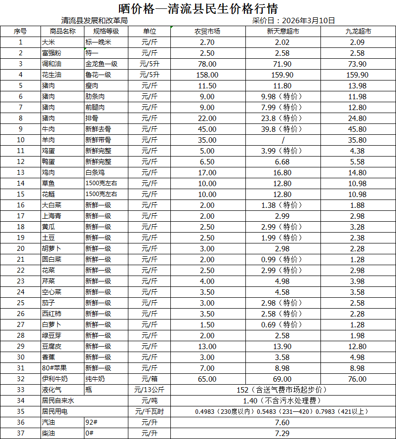 清流县民生价格行情(采价日:2026.03.10)