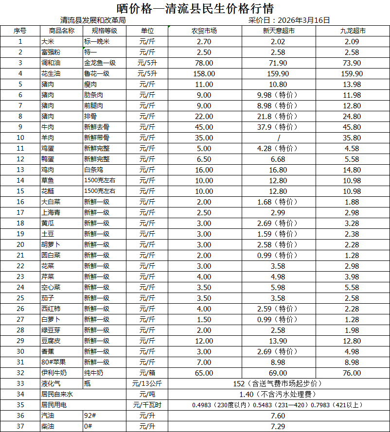 清流县民生价格行情:(采价日:2026.03.16)