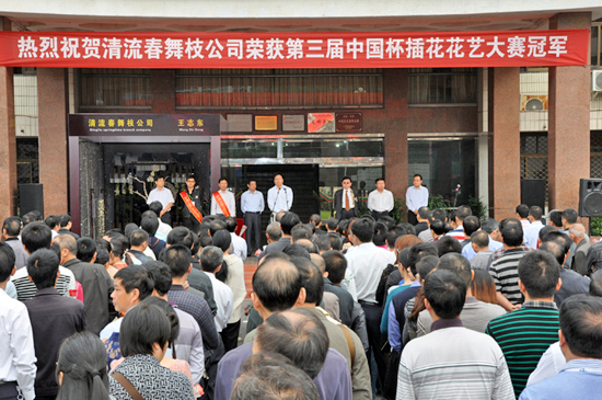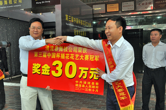 (邓文桂 /文图)金秋十月,花繁果硕。10月18日,清流在县政府大院隆重举行颁奖仪式,重奖获得第三届“中国杯” 插花花艺大赛冠军的清流春舞枝公司。并对清流春舞枝公司及旗下获得大赛冠军的知名花艺师王志东表示热烈祝贺。