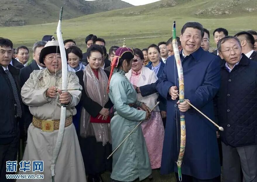 2014年8月22日,国家主席习近平在蒙古国总统额勒贝格道尔吉陪同下前往乌兰巴托市郊观看那达慕。这是习近平与额勒贝格道尔吉一起弯弓搭箭。