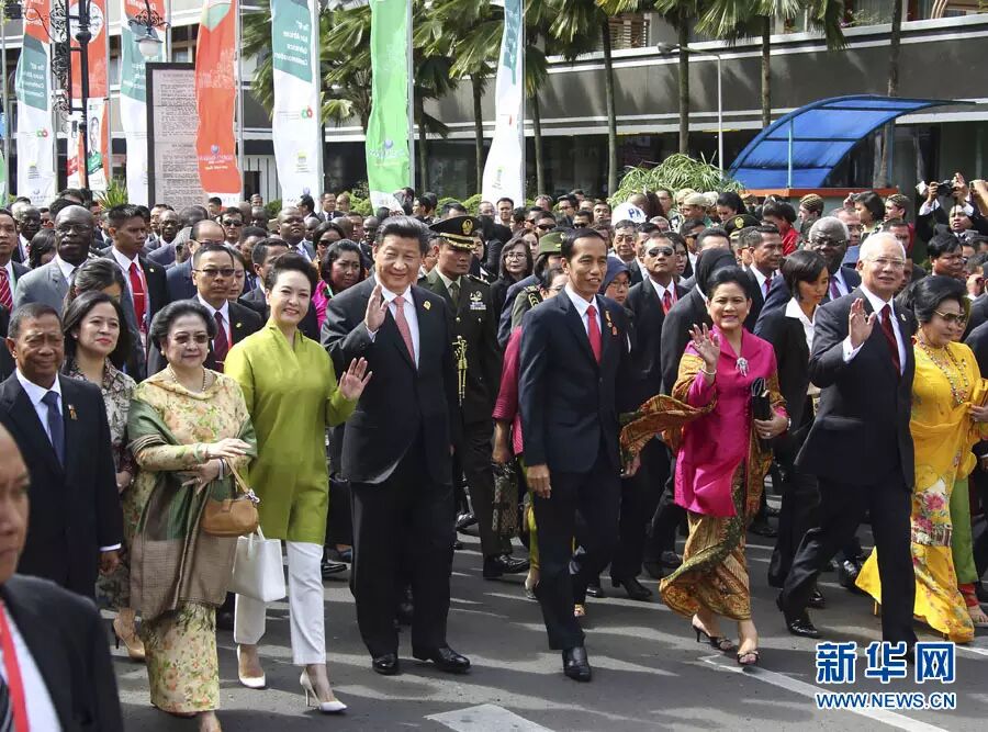 2015年4月24日,在印度尼西亚参加亚非领导人会议的各国领导人来到万隆,纪念万隆会议召开60周年。中国国家主席习近平同来自亚洲、非洲和其他地区的国家领导人沿着亚非大街步行前往万隆会议旧址——独立大厦。这是习近平和夫人彭丽媛同印度尼西亚总统佐科夫妇等走在队伍前列,一边走一边向道路两旁的人群挥手致意。新华社记者 兰红光 摄