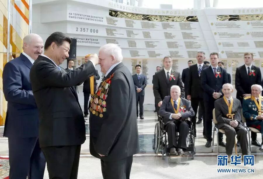 2015年5月11日,国家主席习近平同白俄罗斯总统卢卡申科在明斯克卫国战争历史博物馆会见15名白俄罗斯第二次世界大战老战士代表。这是习近平向老战士颁发纪念奖章。新华社记者 鞠鹏 摄