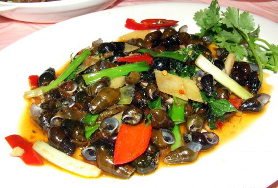 炒溪螺是极佳的下酒小菜。盛夏夜晚纳凉朋友相聚,看着天上的星星,听着朋友谈古论今。这时热情的主妇会在庭院摆放小桌一张,泡上一壶香茶,拿出一箱啤酒,炒上一盘溪螺,盛情招呼客人围着小桌,津津有味地品尝炒溪螺,不一会各人就发出“滋滋”吸螺的响声,那种美妙的乐趣,令人回味无穷。吃螺少了一些文雅,但要有一点技巧。用食指和拇指把螺的尾部放进嘴边,先吸出其汁,顺带一吮,把螺尾肉用力一拉,这叫“欲擒故纵”,再把螺体转过来,把头部放入嘴里用力一吸,整个螺肉便吮进嘴里。一口小酒,一只溪螺,连汤带水,一唆一团肉,辣丝丝,香喷喷,细细品味,鲜香程度,决不亚于生猛海鲜。当然,为图方便,还可以晚上到清流的大排档,八成能吃到这东西,便宜,还有味道,很适合工农劳工享用。清流溪螺,不仅肉质丰腴细腻,味道鲜美,清淡爽口,螺的营养价值也是很高。据分析,每百克螺肉含蛋白质18.2克,脂肪0.6克,还含有碳水化合物以及钙、磷、铁、维生素等营养成分。其中钙的含量特别高。除此之外,它还是一种药用动物。据记载,螺肉味甘、性寒,具有清热、明目、利尿、通淋等功效。