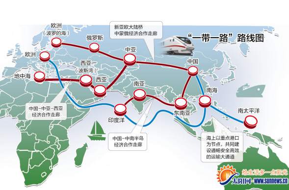 一带指的是“丝绸之路经济带”,是在陆地。它有三个走向,从中国出发,一是经中亚、俄罗斯到达欧洲;二是经中亚、西亚至波斯湾、地中海;三是中国到东南亚、南亚、印度洋。