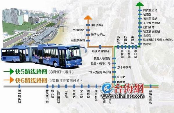 东南网7月30日讯(海峡导报记者 崔晓旭/文 叶允平/制图 吴晓平/图)昨天,厦门市交通运输局发布消息,将新开通两条BRT线路:8月1日,开通试运行快5路(前埔-同安枢纽站),11月1日正式开通快5路;2016年春节前,完善前埔调头区、厦门北站发车区等配套设施,开通快6路(前埔-厦门北站)。
