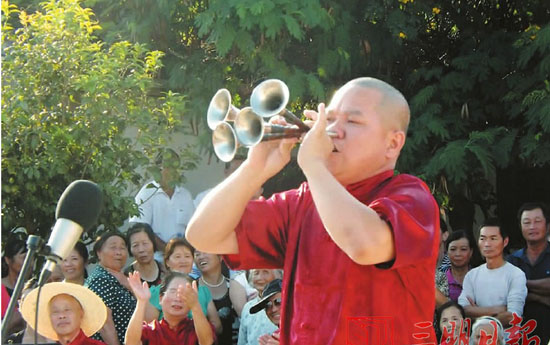 样来。当时乐团不景气,演出有一搭没一搭,工资收入也不稳定;而在各大电视媒体上,各种绝活的报道特别热。林武河决定,一定要在唢呐绝活上“混”出点样子来。